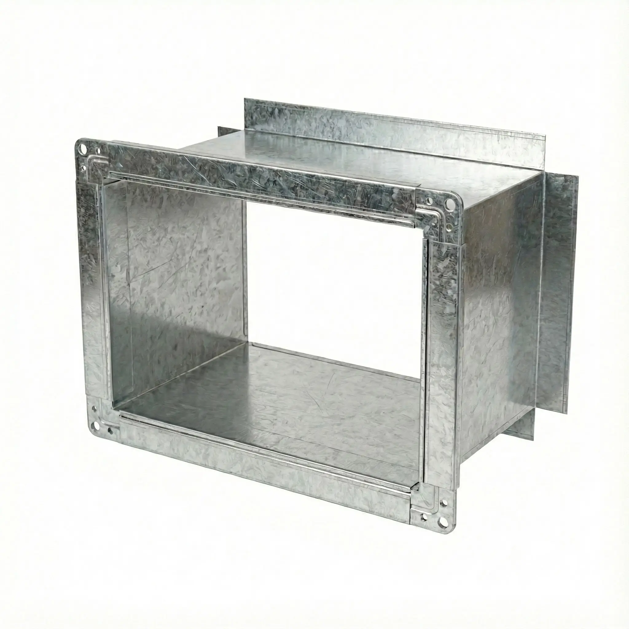 Прямоугольная врезка с фланцем предназначена для подключения дополнительного прямоугольного воздуховода к магистральному каналу с последующим фланцевым соединением. Монтаж выполняется в плоскость стенки основного воздуховода после формирования технологического отверстия по размерам врезки.